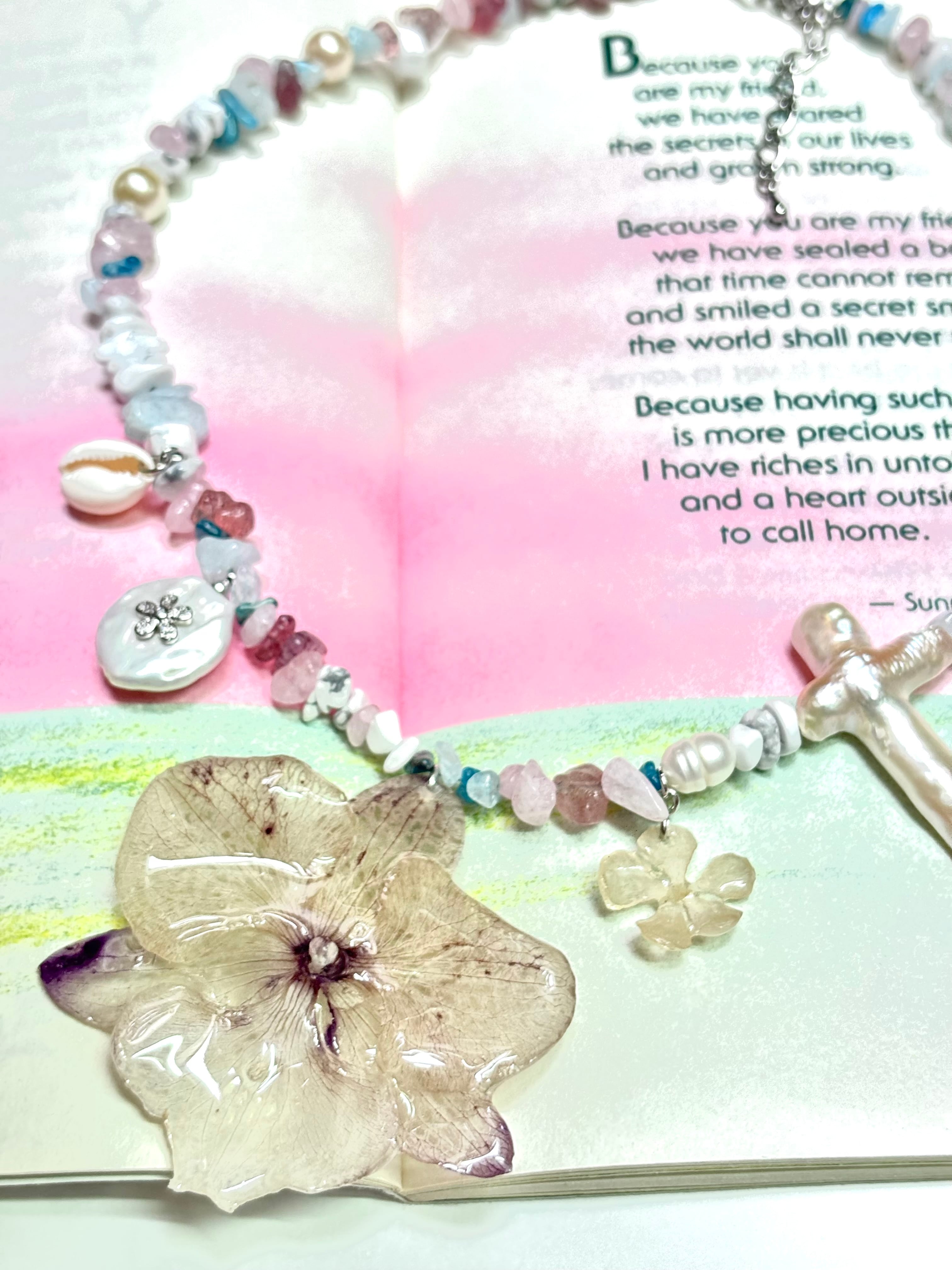 Real flower necklace 胡蝶蘭を使用し、天然石は主に ソーダライト、ピンクトルマリン、ローズクォーツを使用し作製しました。